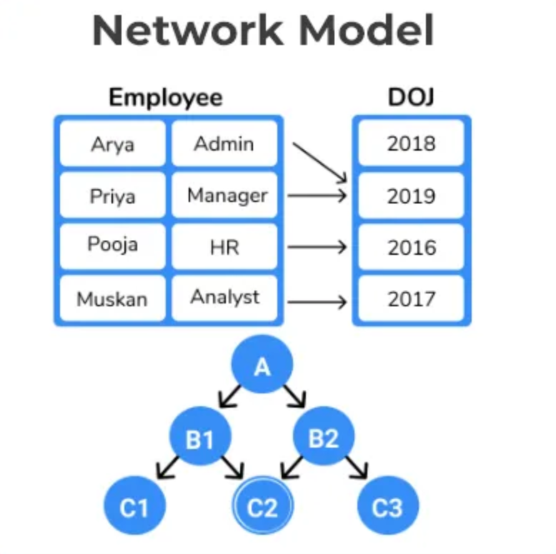 구조: 계층형 데이터 모델과 유사하지만, 각 레코드는 여러 부모 레코드를 가질 수 있습니다. 부모와 자식 간의 관계가 복잡합니다.