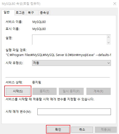 에서 마우스 오른쪽 클릭 후 속성메뉴로 들어갑니다. → 이후 서비스 상태: 시작을 눌리면 됩니다.MySQL + MySQL Workbench 설치방법 (맥)