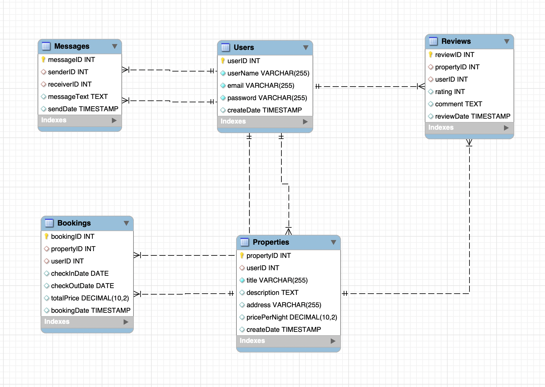 Users와 Properties는 서로 관계가 있으며, 한 사용자가 여러 숙소를 등록할 수 있습니다.
